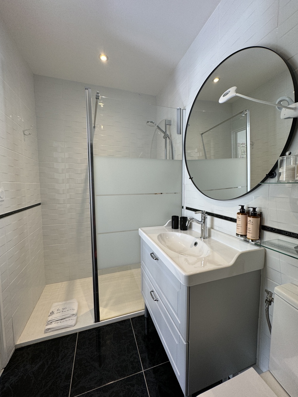 Vous disposez d’une salle d’eau privée avec douche à l’italienne. WC, sèche serviette électrique et sèche cheveux complètent l’ensemble.